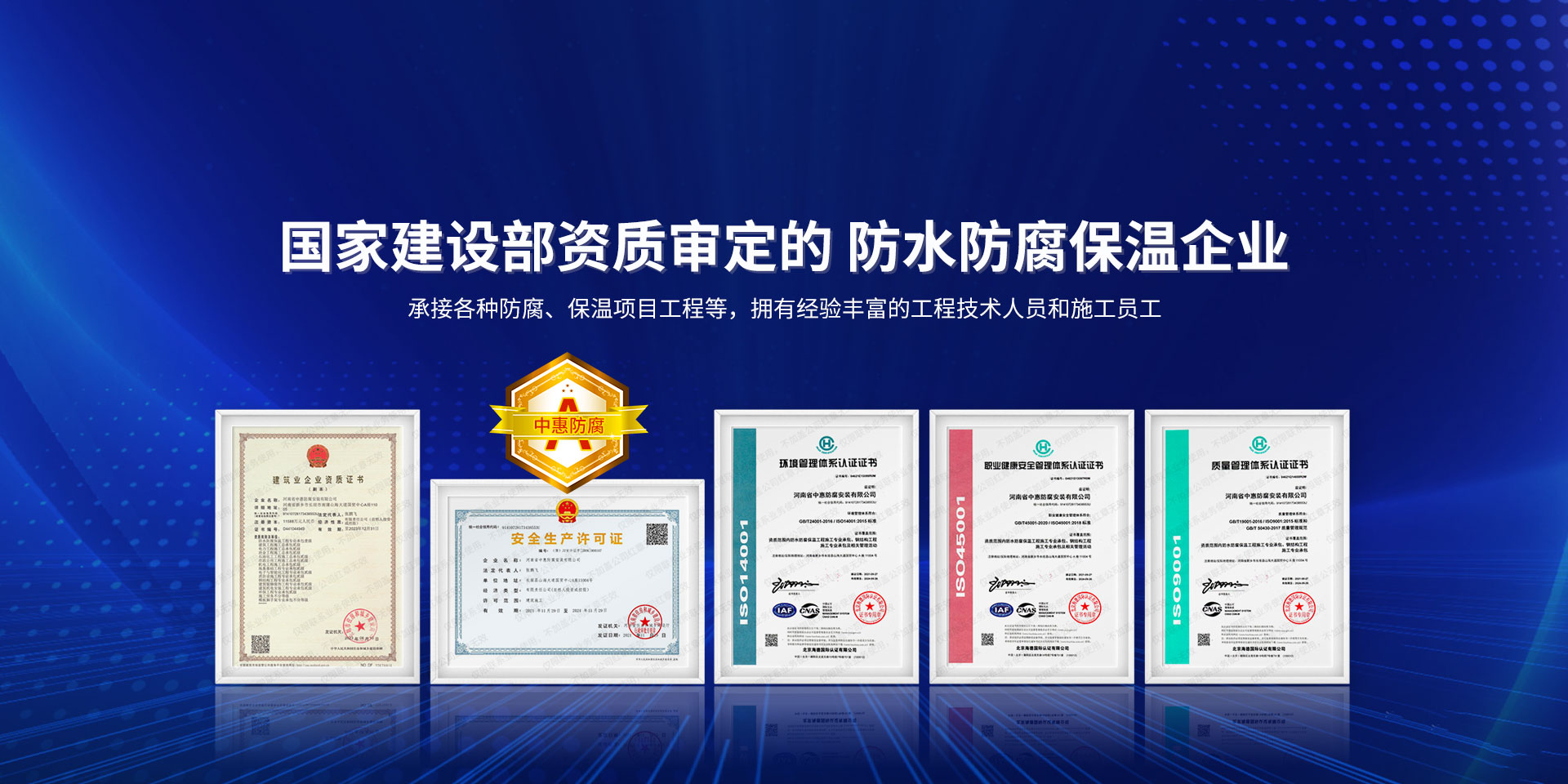 公司經營范圍:防水防腐保溫工程;消防設施工程;建筑裝修裝飾工程;建筑機電安裝工程;電力工程;建筑工程;石油化工工程;工業清洗工程;油罐清洗工程;鋼結構工程;環保工程;模板腳手架工程;電纜防火封堵、防污閃噴涂、外墻外保溫工程;各類施工勞務作業;設備維修、船舶鉚焊、涂裝;電力工程材料、建材、防水材料、防火材料、防腐保溫材料銷售,并相繼通過了GB/T19001-2008idtISO9001:2008GB/T50430-2007質量管理體系認證證書。GB/T24001-2004idtISO14001:2004環境管理體系認證證書。GB/T28001-2011idtOHSAS18001:2007職業健康安全管理體系認證證書。公司是中國防腐蝕于防護協會、中國施工企業管理協會、電力協會和中國鋼結構防水協會會員單位。 公司的經營業務涵蓋了石油、化工、電力、冶金、煤炭、船舶、國防、燃氣、水利、環保、交通運輸、航空及國防軍工和輕紡市政等行業的防腐保溫絕熱設備。鋼結構安裝、防火、防水、金屬噴鍍、聚脲噴繪、陰極保護、防滲透堵漏、玻璃鋼及各種磚版材料襯里、橡膠襯里、煙氣硫和耐酸溶劑腐蝕等工程施工。公司連續十年榮獲“省市先進施工企業”“安全生產先進單位”“重合同,守信用企業”和“AA***資質企業”的稱號。2000年被命名為市級文明單位,2002年被國家工商行政管理局命名為“重合同,守信用的企業”、被中國工業防腐蝕技術協會命名為“防腐蝕企業,能源節約及環境保護領域有豐富的經驗和***的業績。工程一次交驗合格率100%。其中攀枝花鋼鐵公司煉鐵廠四號高爐及熱風爐防腐工程、上海寶鋼公司煤氣柜防腐工程、撫順石油一廠裝置防腐項目、齊魯石化公司稀烴廠高塔防腐工程、吉林化學工業公司煉油廠油罐防腐工程、天津石化熱電廠六號爐頂棚聯絡管保溫工程、大慶油田(太倉)力神泵業工程、中國化學工程第十一建設工程、中原油田勘探局工程、中國石化銷售有限公司華北分部、魯皖輸油管道工程、貴州開磷息烽合成氨工程、陜西黃陵煤化工程、中國石油天然氣西部管道塔里木輸油工程、邯鋼集團邯寶鋼鐵公司煉鐵工程、德州供電工程、吉寶(南通)船廠工程,偃師華潤熱力工程、鄭州熱力總公司。 河南省中惠防腐安裝有限公司愿以豐富的施工經驗,***的技術,***的設備,***的管理,***的服務,竭誠為國內外廣大的用戶提供***滿意、******的工程作品。 我公司愿與國內外同仁一道,團結協作,共同推進防腐蝕行業發展! 公司地址:河南省長垣縣建設路北段360號 固定電話:0373-8866488 郵編:453400 網址:http://www_zhff_com_cn.cq267.com